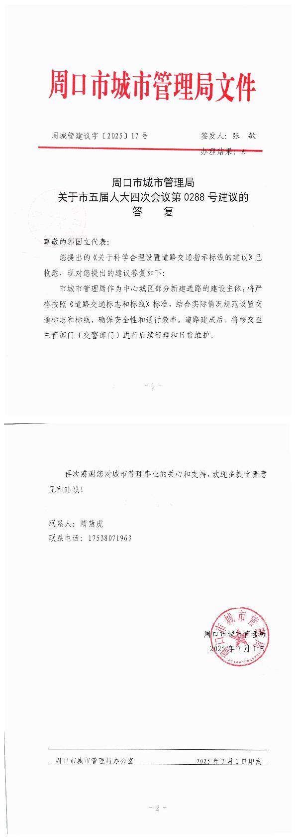 周口市城市管理局关于市五届人大四次会议第0288号建议的答复
