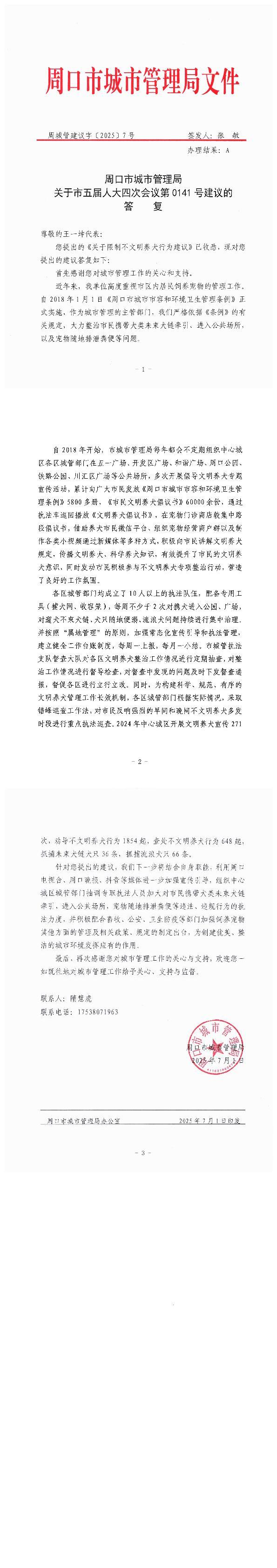 周口市城市管理局关于市五届人大四次会议第0141号建议的答复