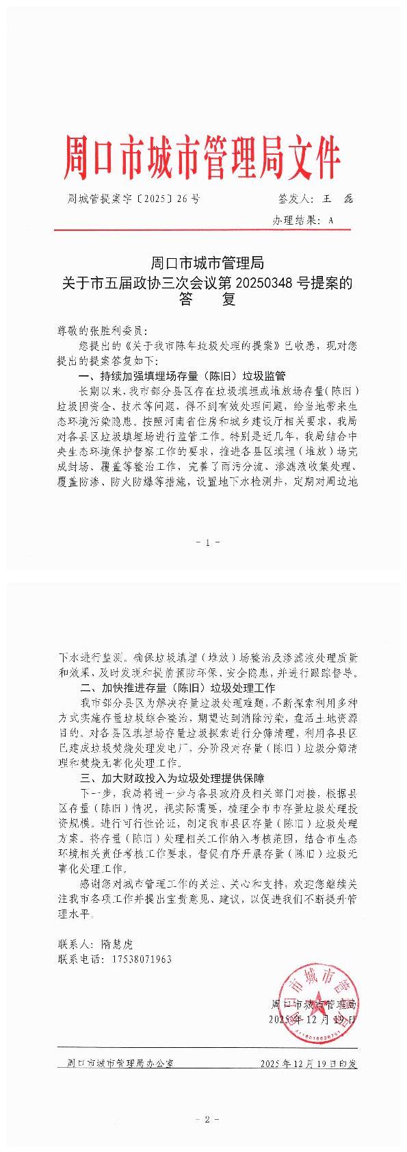 周口市城市管理局关于市五届政协三次会议第20250348号提案的答复