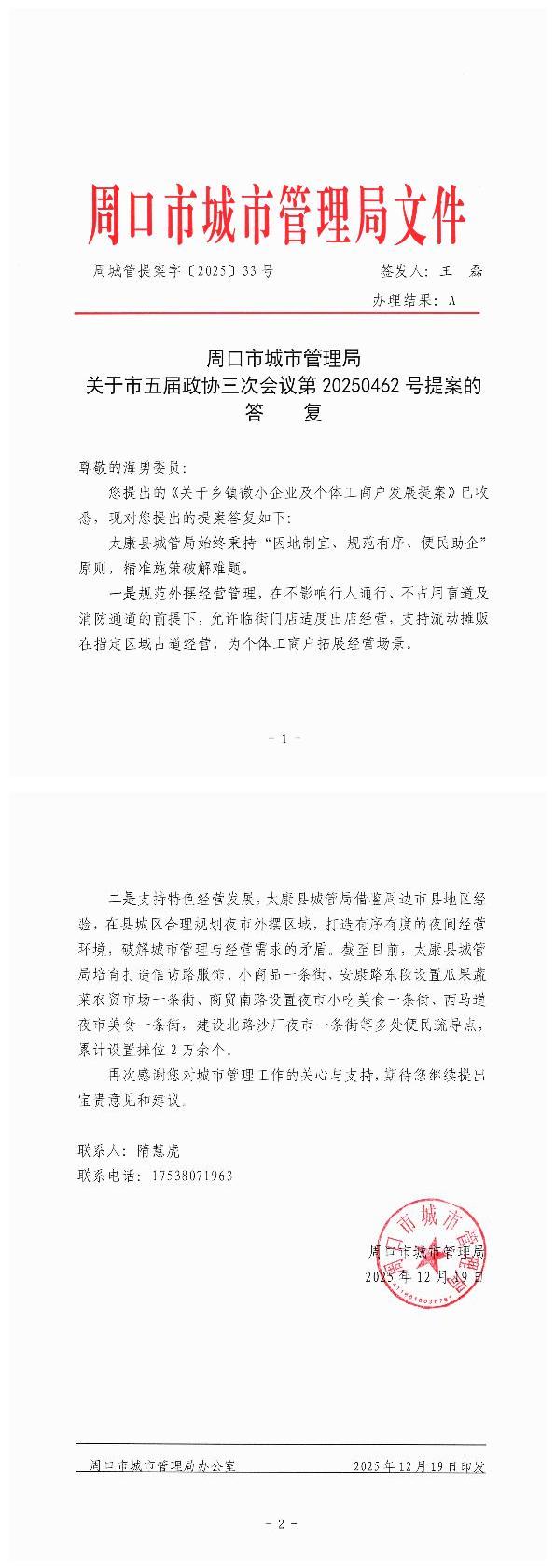 周口市城市管理局关于市五届政协三次会议第20250462号提案的答复
