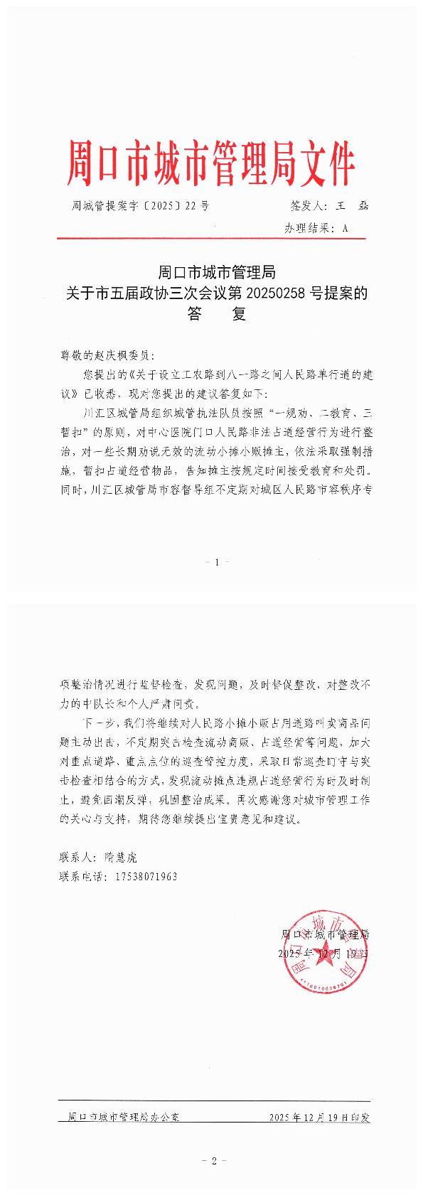 周口市城市管理局关于市五届政协三次会议第20250258号提案的答复
