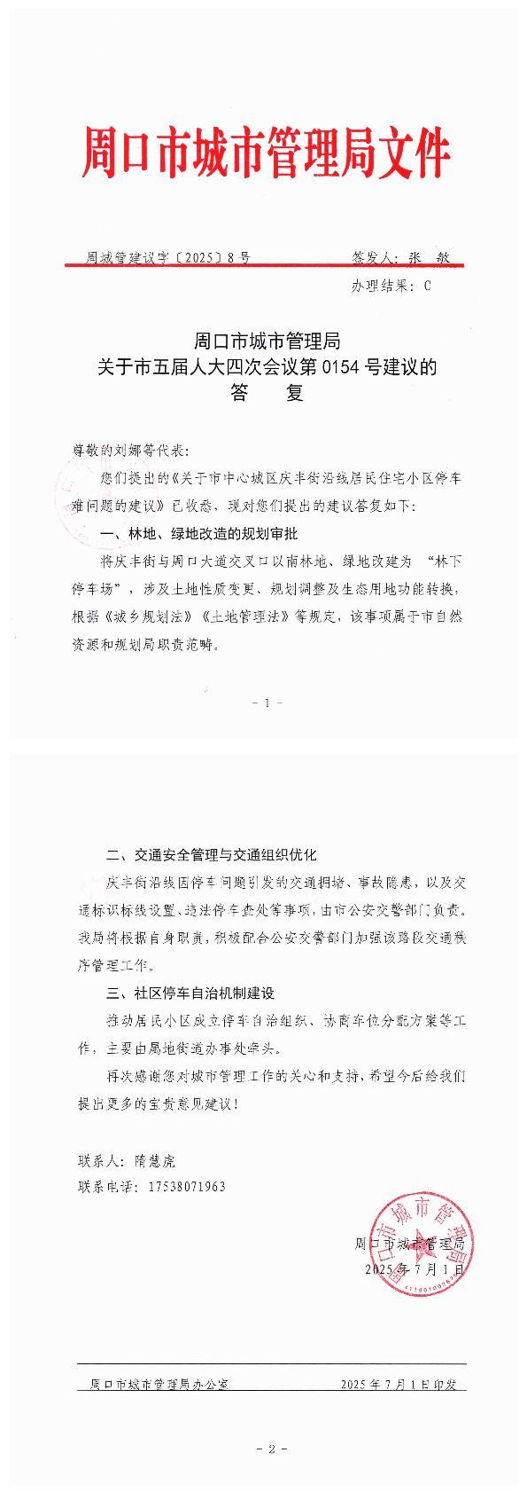 周口市城市管理局关于市五届人大四次会议第0154号建议的答复