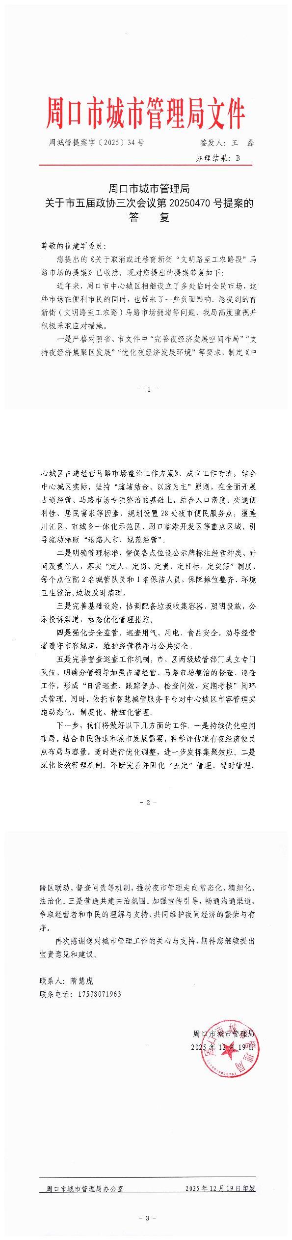 周口市城市管理局关于市五届政协三次会议第20250470号提案的答复